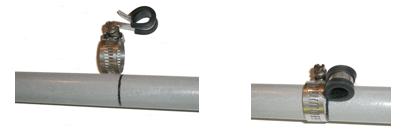 Each wire attachment consist of a stainless steel hose clamp that holds a loom clamp in place. These and the stop clamps should be installed at the locations shown on the sketch below. On the thick sections, use #10 size hose clamps, on the medium spreader sections, use #6 hose clamps and on the smallest sections, use #5 hose clamps. These sizes might be found at Lowes or Home Depot but are not likely to be stainless steel.